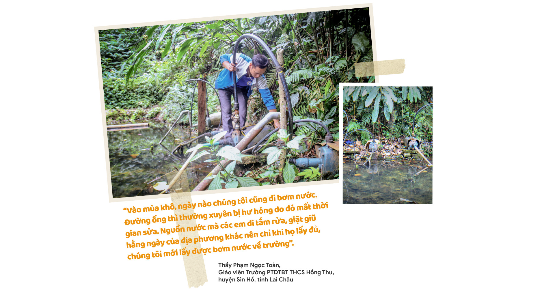Chia sẻ về nỗi lòng của người sống trong vùng khát nước, thầy Sơn đồng thời thông tin: Để khắc phục tình trạng thiếu nước kéo dài trong mùa khô hanh, hằng năm, Trường PTDTBT THCS xã Hồng Thu lại thăm dò các mạch nước ở khe suối và quyên góp tiền mua ống nước hơn 600m, dây điện, máy bơm để lọc sử dụng nấu ăn cho học sinh bán trú. Tuy nhiên, tại khe suối cũng chi chít ống nước của người dân nên lúc bơm được lúc không.