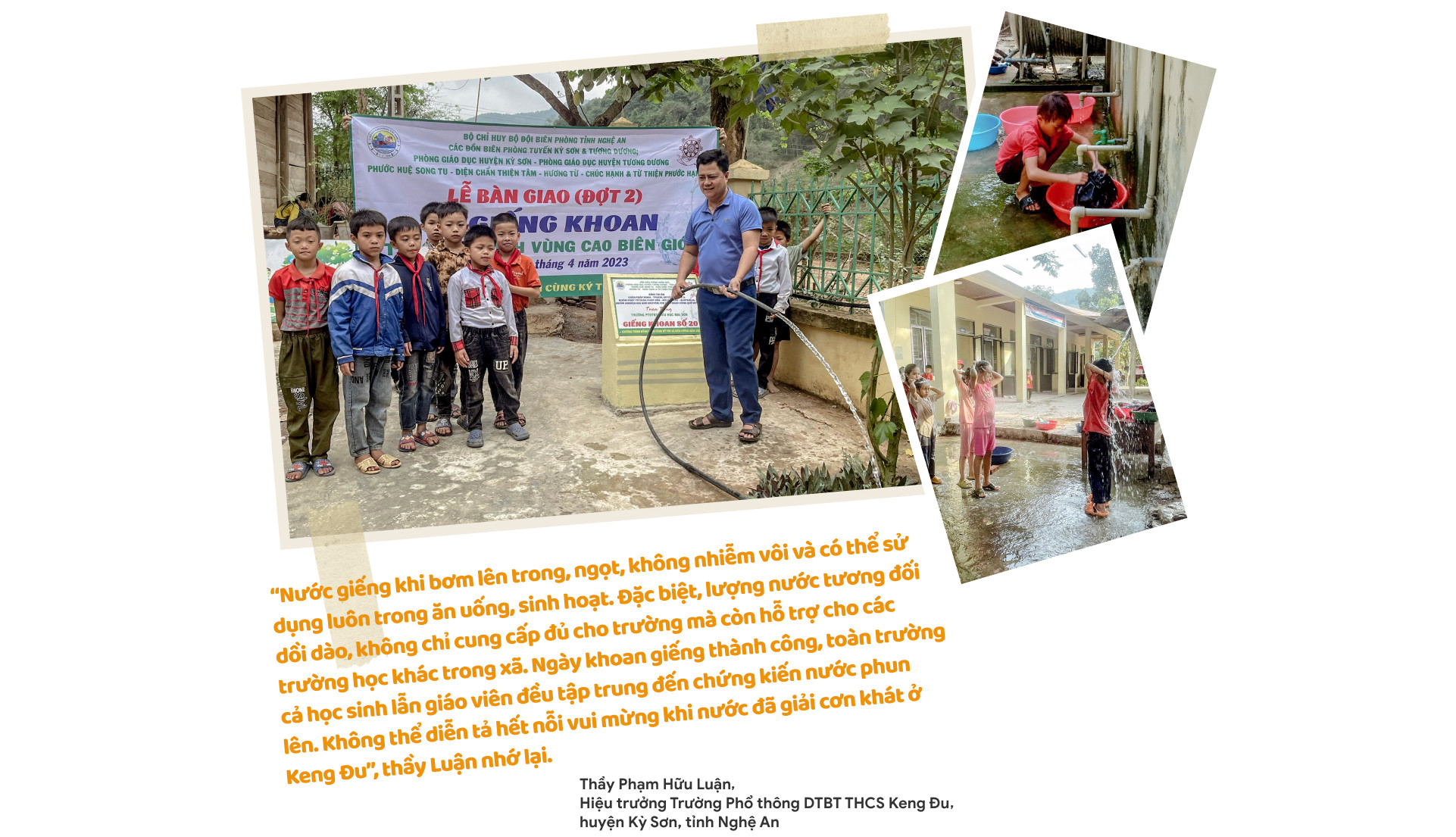 Tại huyện Kỳ Sơn, Nghệ An, từ cuối năm 2022, Trường PTDTBT THCS Keng Đu khoan được giếng nước, nên chia sẻ cho cả trường tiểu học và mầm non.
