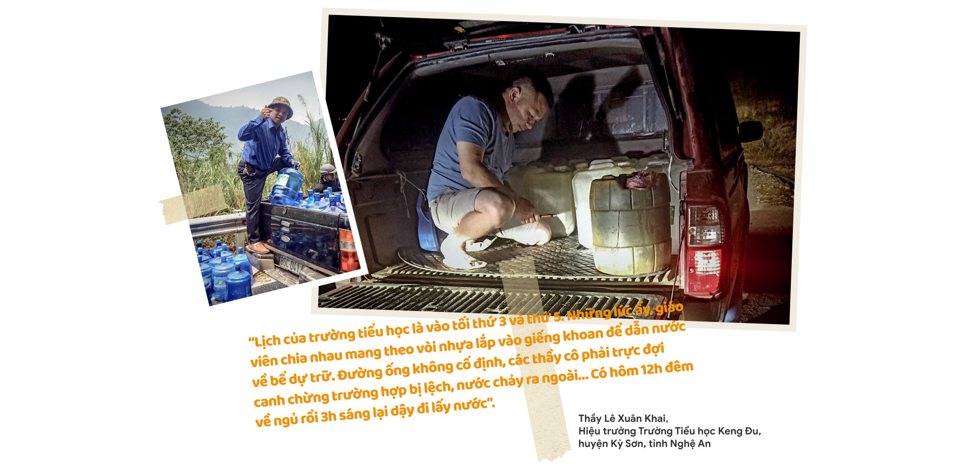 “Lịch của trường tiểu học là vào tối thứ 3 và thứ 5. Những lúc ấy, giáo viên chia nhau mang theo vòi nhựa lắp vào giếng khoan để dẫn nước về bể dự trữ. Đường ống không cố định, các thầy cô phải trực đợi canh chừng trường hợp bị lệch, nước chảy ra ngoài… Có hôm 12h đêm về ngủ rồi 3h sáng lại dậy đi lấy nước”, Hiệu trưởng Trường PTDTBT Tiểu học Keng Đu kể.