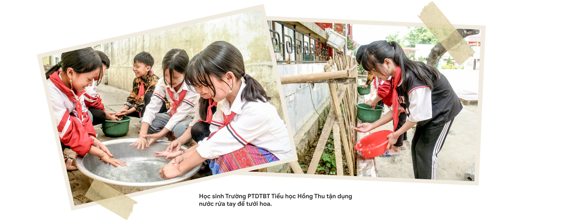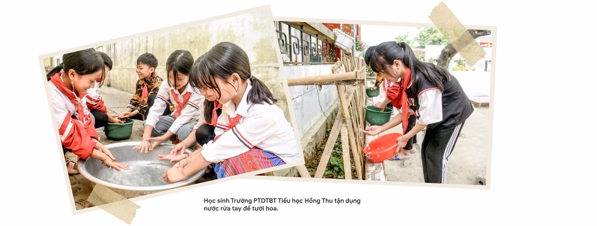 Tương tự, Trường PTDTBT Tiểu học Hồng Thu cũng giáo dục học sinh phải sử dụng nước tiết kiệm. Thay vì trực tiếp xả nước, nhà trường hướng dẫn trò hứng nước vào chậu để rửa tay. Nước sau sử dụng được tận dụng để tưới hoa hoặc dội nhà vệ sinh.
