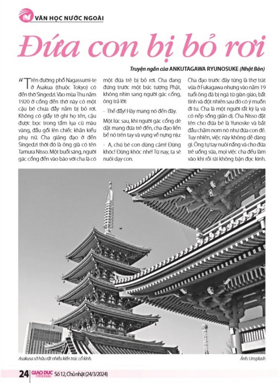 Đọc truyện “Đứa con bị bỏ rơi” (Ankutagawa), người ta xót thương cho đứa trẻ tội nghiệp, cảm phục tấm lòng từ bi của người cha đạo đáng kính, biết ơn người phụ nữ nhân từ đã trao yêu thương sưởi ấm cuộc đời. Nhân sinh bảy nổi ba chìm, nhiều nụ cười và còn đó những dòng nước nước mắt. Cần lắm những tấm lòng thiện, mang yêu thương gieo mầm hạnh phục, tỏa nắng cho đời thêm những an vui. Bởi thế, câu chuyện nhỏ của Ankutagawa Ryunosuke gần trăm năm về trước trở thành bài học ý nghĩa với tất cả chúng ta.