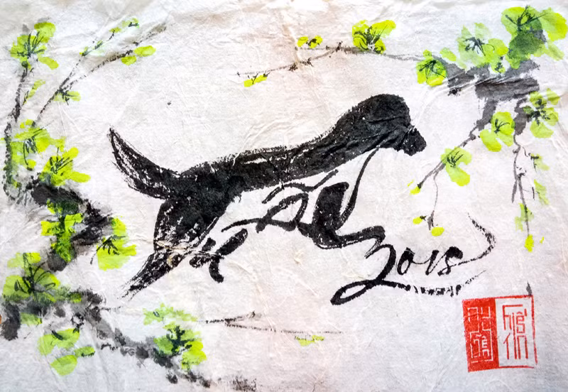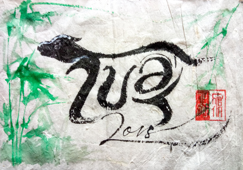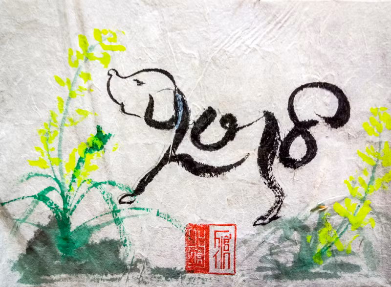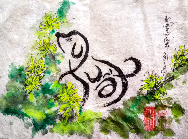 Hình ảnh chú chó con thân thương đang ngồi ung dung tự tại trước những đóa hoa cúc (mùa thu) rất nên thơ, gần gũi. Chú chó này được tạo từ chữ Mậu Tuất rất duyên dáng, thanh thoát, mang ý nghĩa về sự bình an trong tâm hồn, sự an lạc trong cuộc sống.