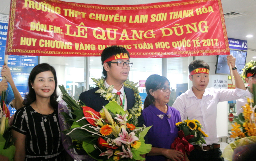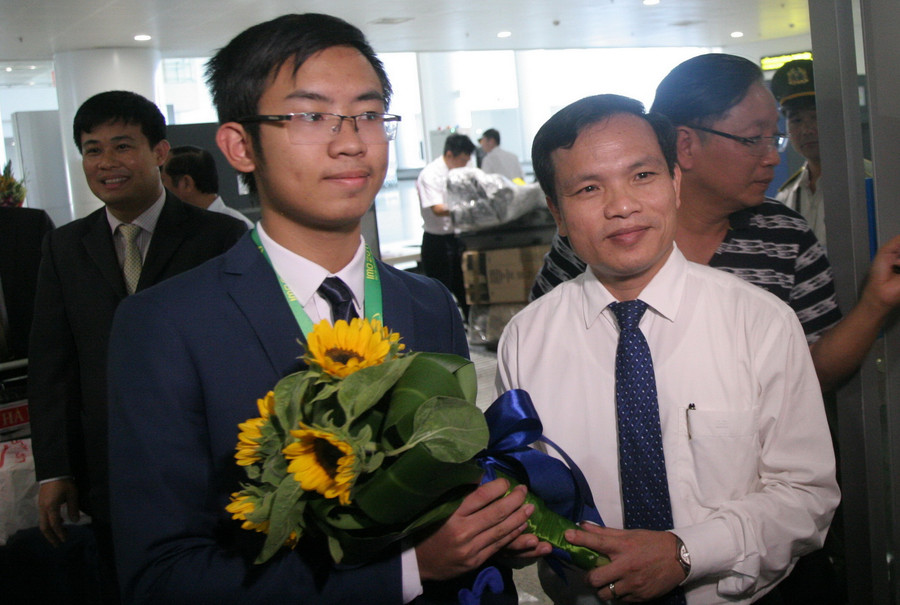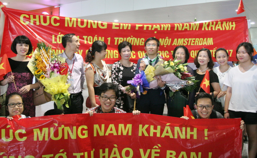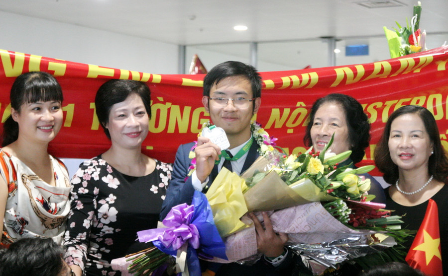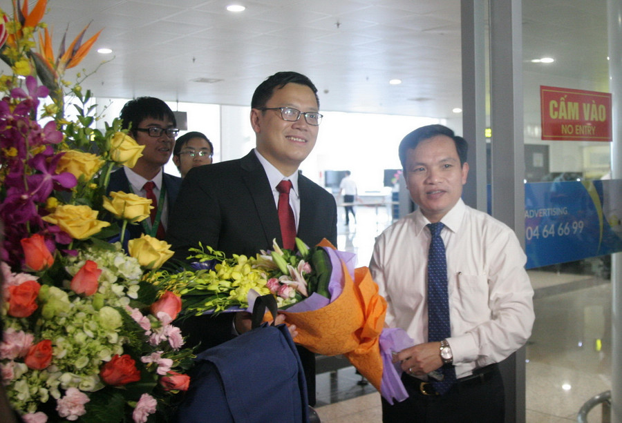 Đón đoàn tại sân bay quốc tế Nội Bài có ông Mai Văn Trinh- Cục trưởng Cục Quản lý chất lượng (Bộ GD&ĐT), lãnh đạo các Sở GD&ĐT, lãnh đạo các nhà trường, các thầy cô giáo và bạn bè, người thân của các em học sinh dự giải.