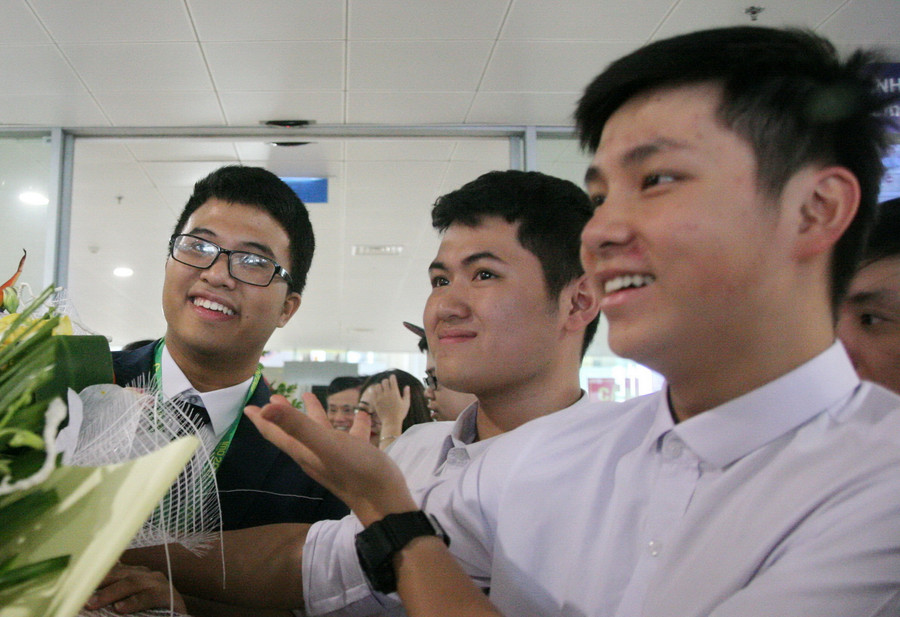 Sáng nay 25/5, đoàn học sinh Việt Nam tham dự kì thi Olympic Toán học quốc tế tại Brazil đã về đến Hà Nội trong sự đón chào nồng nhiệt của các thầy cô, người thân và bạn bè.