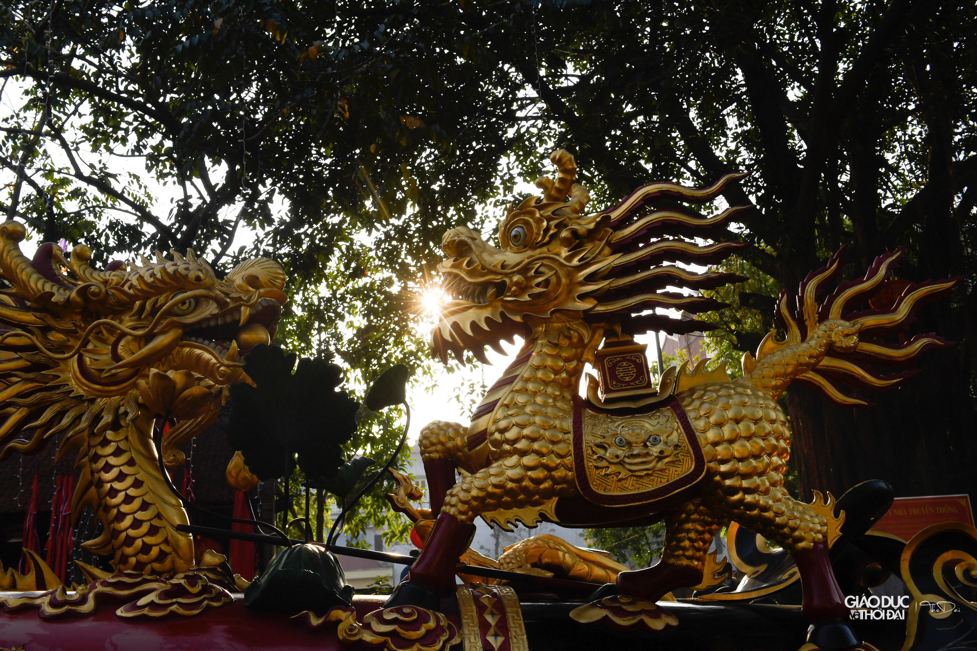 | Hai quả pháo được làm bằng gỗ, sơn son thếp vàng, dài 6m, đường kính hơn 60cm. Thân pháo chạm trổ hình long, lân, quy, phượng với mong muốn năm mới mưa thuận gió hòa. |