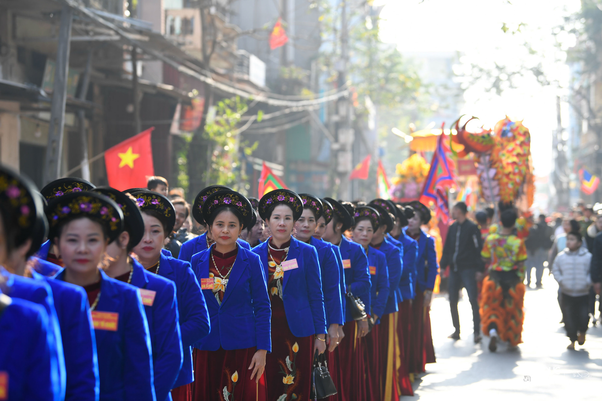 | Hàng trăm người tham gia lễ rước kéo dài chừng hai tiếng, trải qua nhiều nghi thức từ nhà trưởng đám đến đình làng. |