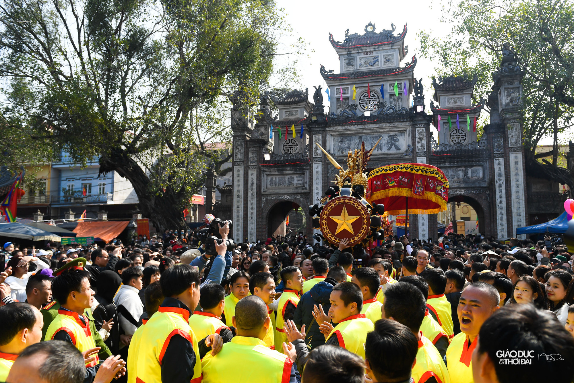 | Khoảng 11h, hai quả pháo được rước vào đình làng trong sự hò reo của nhiều người. |