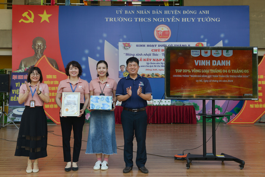 | Trao tặng chứng nhận đồng hành, tặng quà cho Ban Giám hiệu nhà trường, đồng thời trao tặng tặng quà cho 10 giáo viên tích cực hỗ trợ các học sinh ôn tập Toán TOFAS. |