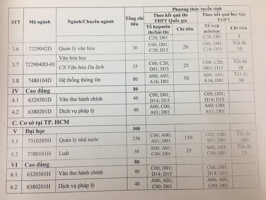 Điểm xét tuyển giữa các tổ hợp C00, C20 cao hơn điểm xét tuyển với các tổ hợp A00, A01, A10, A16, C03, C15, C19, C22, D01, D02, D15 từ 1.0 đến 3.0 điểm tùy theo từng ngành.