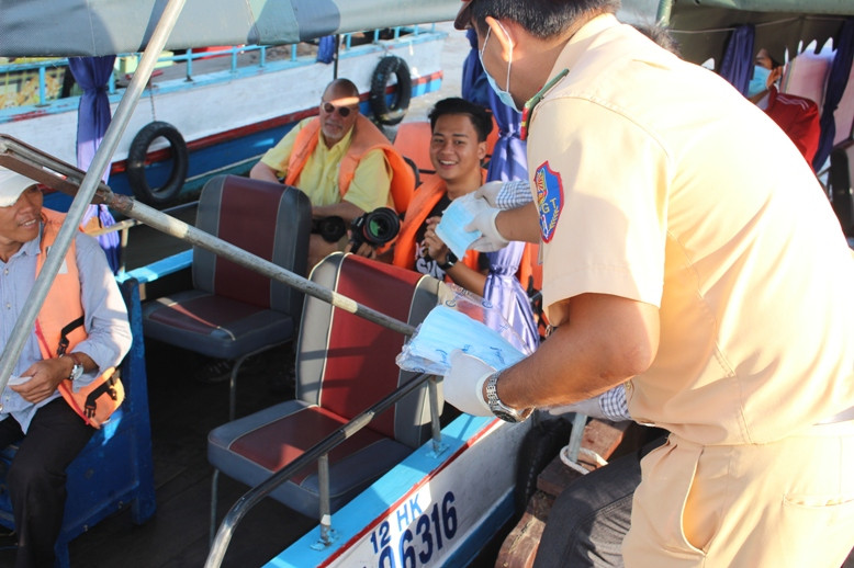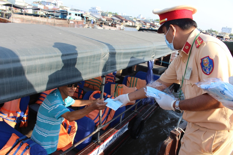 Bên cạnh còn có lực lượng Cảnh sát giao thông tham gia hỗ trợ phân luồng tàu thuyền, tuyên truyền cho du khách và người dân vùng sông nước chợ nổi trong công tác phòng chống dịch Corona.