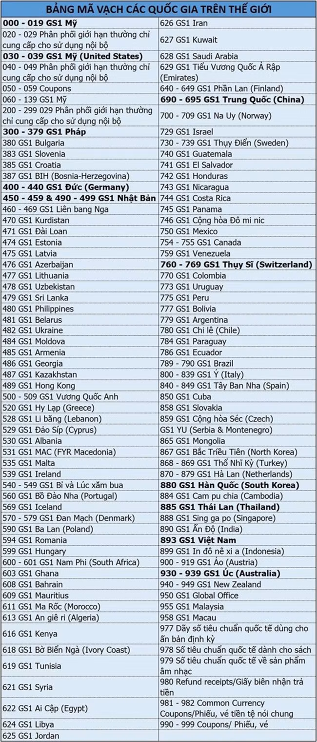 Những số không có trong danh sách là các nước chưa đăng kí mã vạch nhóm GS1.