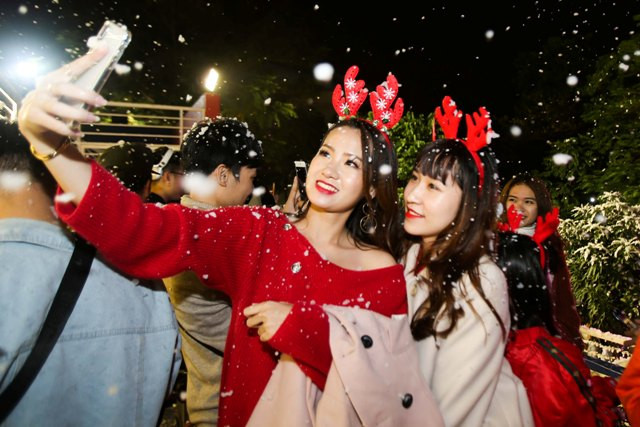 | Không chỉ có sinh viên, nhiều gia đình xung quanh khu vực trường cũng dẫn theo con nhỏ đến để ngắm "tuyết trắng" mùa Giáng sinh. |