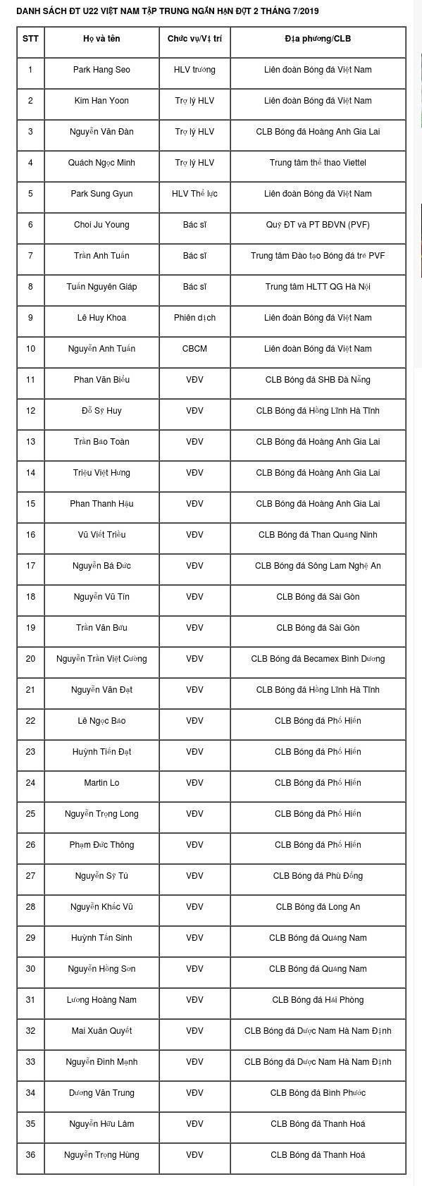 Bên cạnh những người đã góp mặt ở đợt tập trung gần nhất, HLV Park đã gọi lại nhiều cái tên quen thuộc như Triệu Việt Hưng, Huỳnh Tấn Sinh, Phan Thanh Hậu, Lương Hoàng Nam.