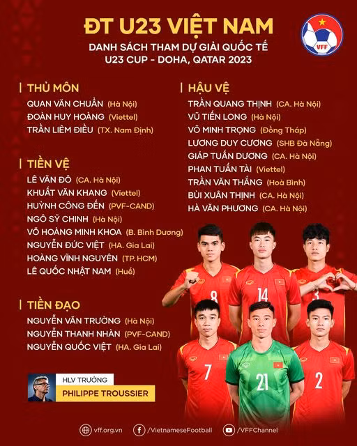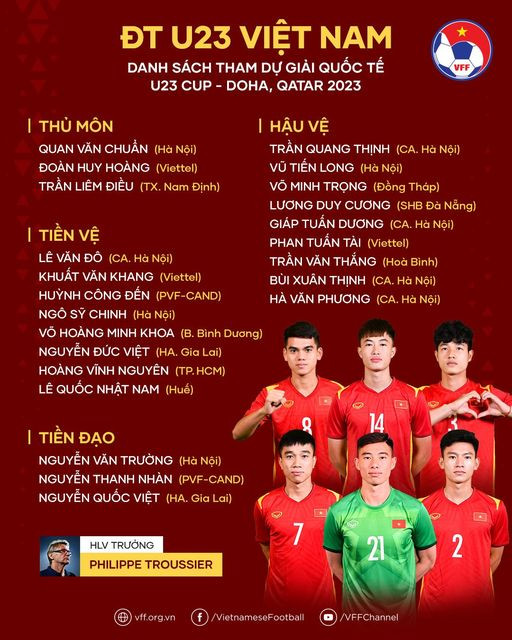 Chiều nay (16/3), HLV trưởng Philippe Troussier đã đưa ra quyết định về danh sách chính thức 23 cầu thủ đội tuyển U23 Việt Nam tham dự giải bóng đá quốc tế U23 Cup- Doha, Qatar 2023.