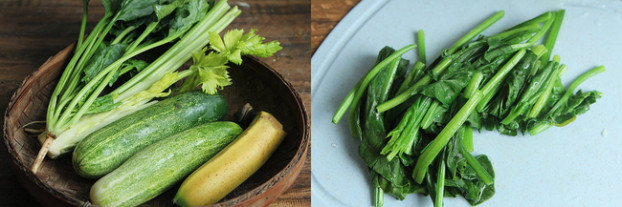 - Cần tây, rau chân vịt đem rửa sạch rồi cho vào nước sôi chần qua khoảng 1 phút thì vớt ra.