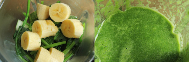 - Lần lượt cho rau chân vịt, cần tây, dưa chuột và chuối vào máy xay sinh tố.