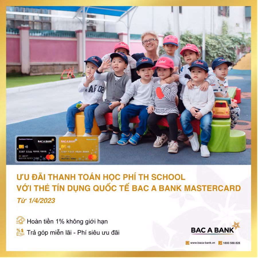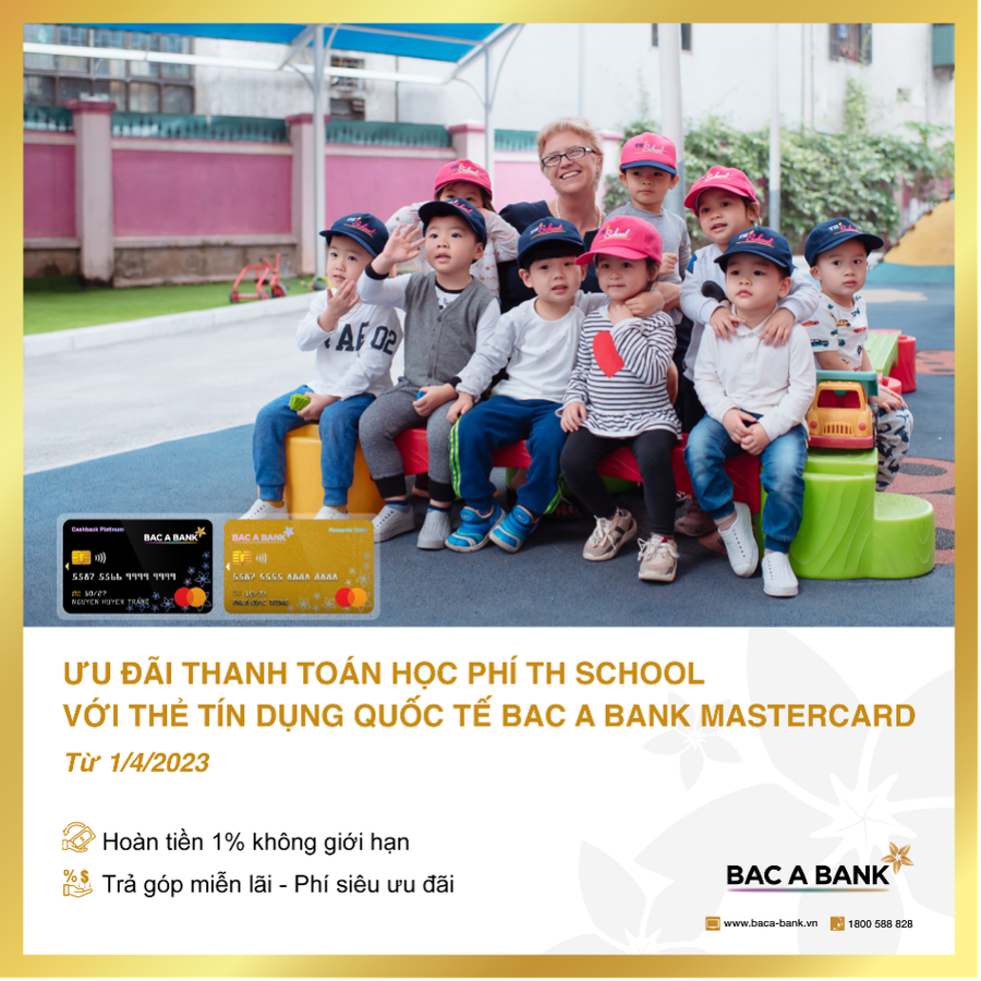 Chủ thẻ tín dụng quốc tế BAC A BANK MasterCard sẽ được hoàn 1% giá trị học phí và các loại phí khác tại TH School. Hấp dẫn hơn, số tiền được hoàn là không giới hạn, thể hiện nỗ lực của cả ngân hàng và nhà trường trong việc đồng hành, chia sẻ tài chính cùng phụ huynh và gia đình.
