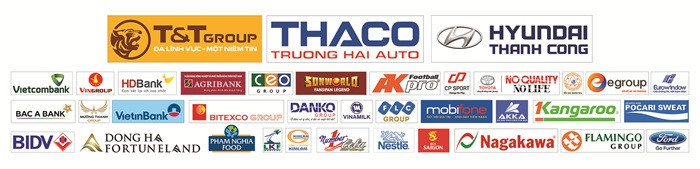 Tập đoàn T&T; Công ty CP ô tô Trường Hải (Thaco); Công ty CP Hyundai Thành Công Việt Nam; Tập đoàn Vin Group; Ngân hàng Vietcombank (VCB); Tập đoàn Mường Thanh; Tập đoàn Kangaroo, Ngân hàng TMCP phát triển TP Hồ Chí Minh (HD bank); Ngân hàng TMCP Công Thương Việt Nam (VietinBank); Tập đoàn Sun Group; Tập đoàn CEO; Tập đoàn FLC; Công ty cổ phần Eurowindow (Thăng Long); Tập đoàn giáo dục EGROUP; Tập đoàn Nagakawa Việt Nam; Tổng công ty Viễn thông MobiFone; Ngân hàng thương mại CP Đầu tư và phát triển Việt Nam (BIDV); Công ty Toyota Việt Nam; Tập đoàn DANKO; Ngân hàng Bắc Á; TH Group; Công ty CP tập đoàn Flamingo; Tâp đoàn Tân Hiệp phát; Công ty TNHH Tập đoàn Bitexco; Ngân Hàng Nông nghiệp & phát triển nông thôn (AGRIBANK); Ford Việt Nam; Công ty TNHH nhà nước MTV Yến Sào Khánh Hòa; Công ty CP Thế giới Bóng đá; Công ty TNHH ANC Việt Nam; Công ty TNHH thể thao CP…