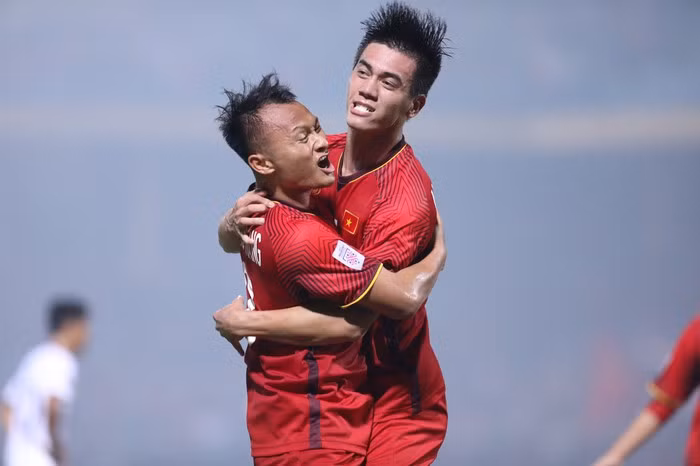 Tiến Linh ăn mừng bàn thắng cùng Nguyễn Trọng Hoàng. Tình huống này, Trọng Hoàng là người tung quả tạt như đặt bên cánh phải cho Tiến Linh đánh đầu.