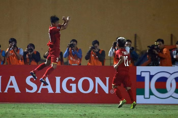 Văn Đức chạy ra đường biên ăn mừng bàn thắng theo phong cách Cristiano Ronaldo.