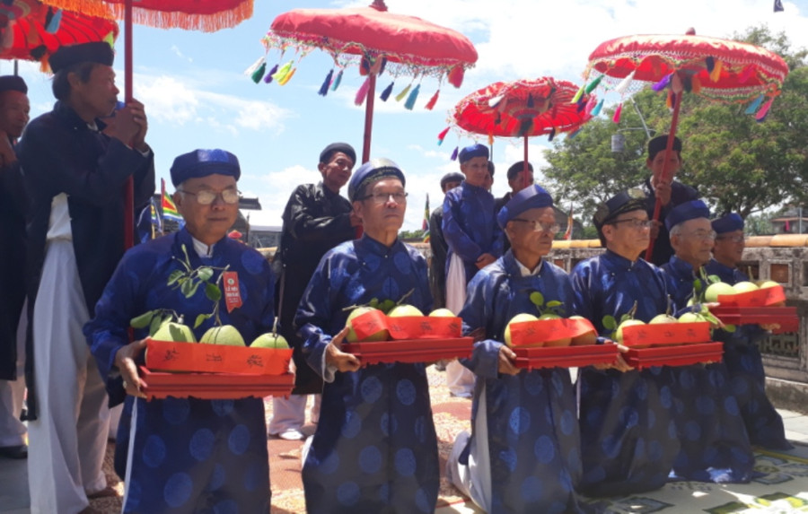 | Người dân làng Lương Quán phường Thủy Biều sau khi dâng cúng tại đình làng Lương Quán được gánh bộ thanh trà xuống sông Hương vào Đại Nội   |