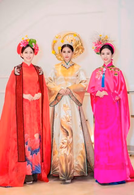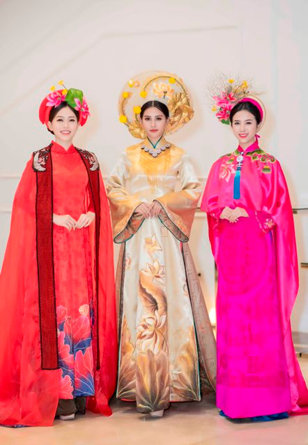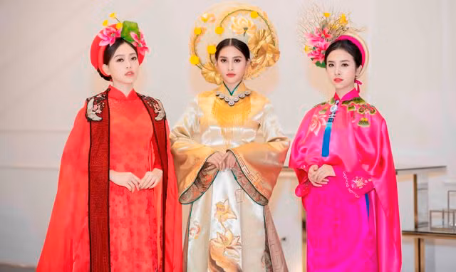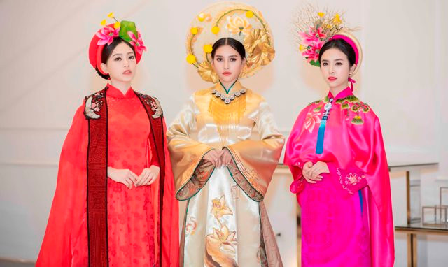 Sải bước trong bộ sưu tập “Huyền bí phương Đông”, “Nét xưa” của NTK Trần Thiện Khánh lấy ý tưởng từ cung đình Huế, trong khi Hoa hậu Tiểu Vy đảm nhận vị trí vedette với áo dài màu vàng – tựa trưng cho Hoàng tộc thì Phương Nga và Thúy An lần lượt diện những tà áo dài mang sắc đỏ và hồng cùng những chiếc mấn được thiết kế tỉ mỉ.