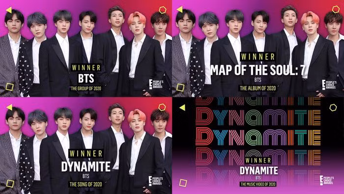 BTS đã chiến thắng tất cả các hạng mục mà nhóm được đề cử tại 2020 People"s Choice Awards, bao gồm: Nhóm nhạc của năm, Album của năm, Bài hát của nam và Video âm nhạc của năm với bài hát Dynamite và Album Map Of The Soul: 7.