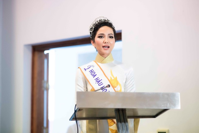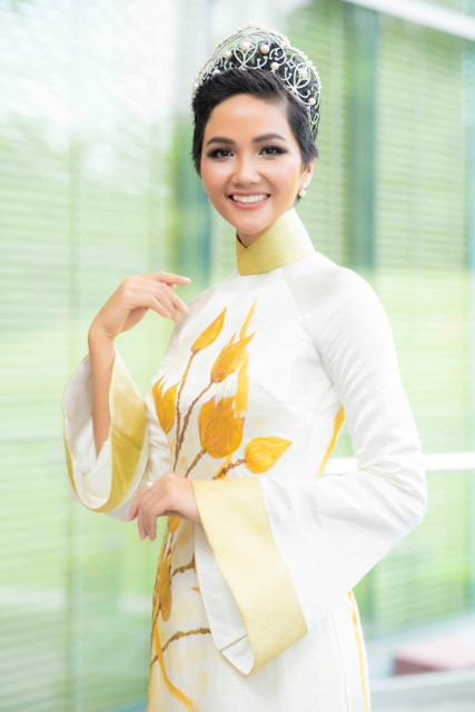 Với lần xuất hiện này, Hoa hậu H’Hen Niê chọn trang phục áo dài thêu họa tiết hoa sen vàng nổi bật trên nền trắng, kết hợp cùng vương miện. Người đẹp ít khi đội vương miện tại các sự kiện nhưng lần này với chiếc vương miện là minh chứng rõ ràng nhất cho những nỗ lực, cố gắng hoa hậu.