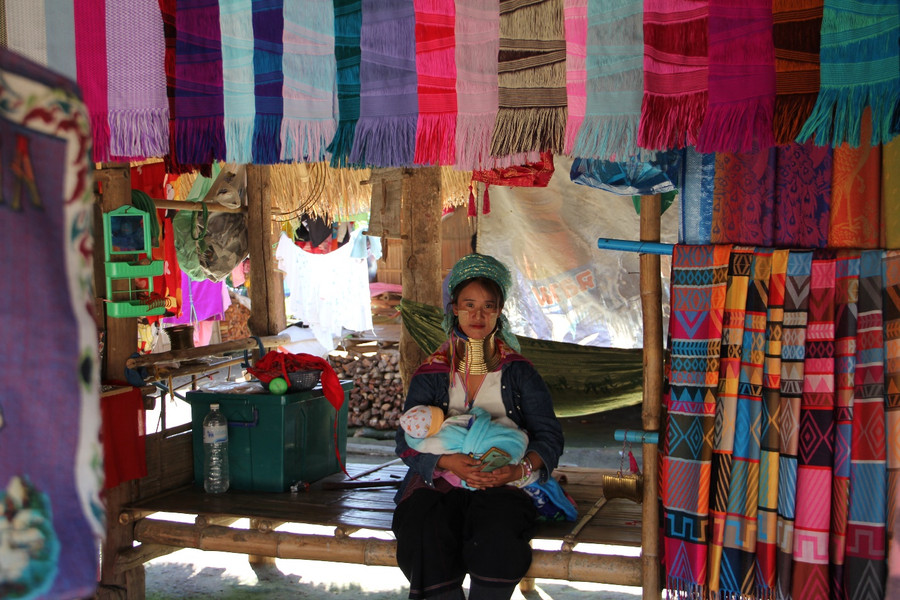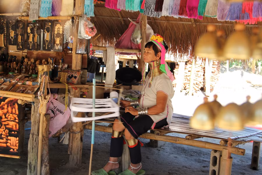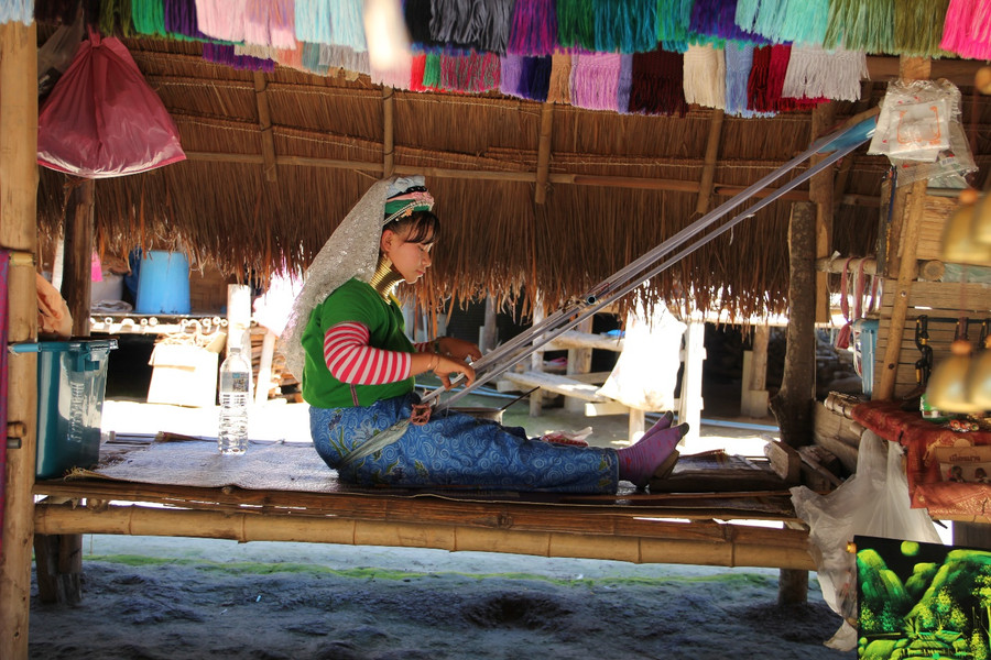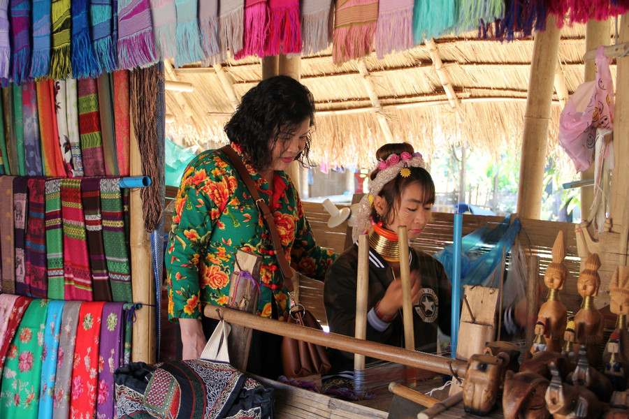 Người cổ dài Karen dệt vải, khăn choàng, làm các đồ thủ công mỹ nghệ để bán cho khách du lịch.