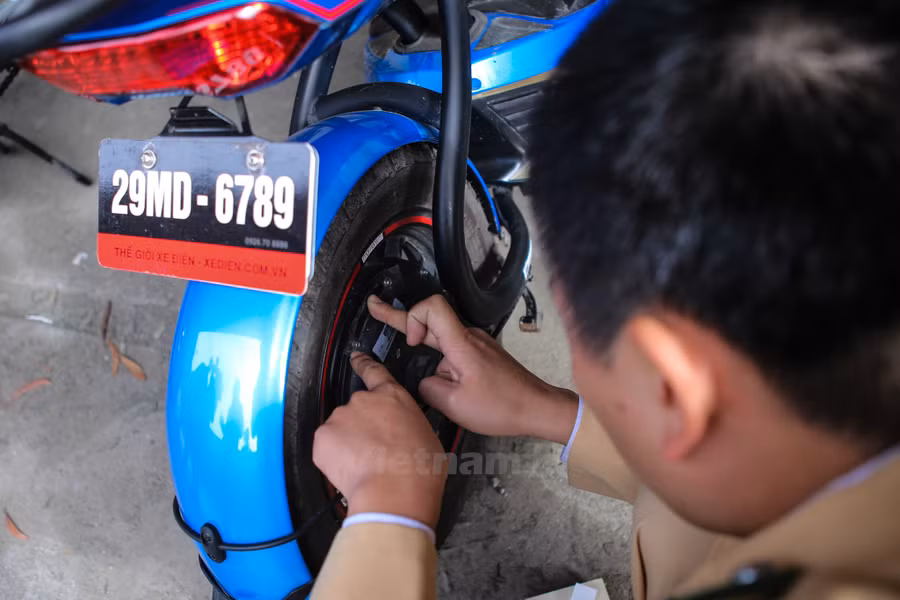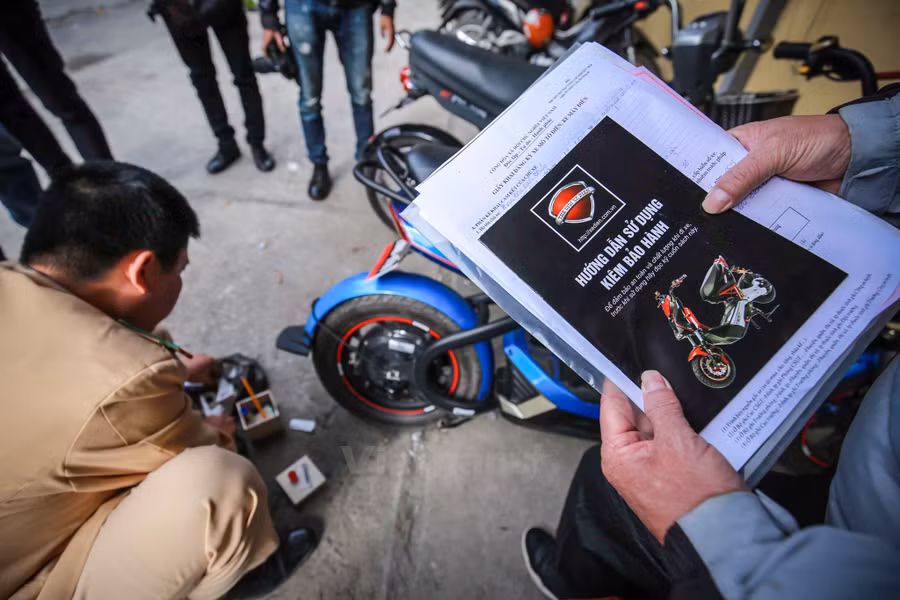 Xe máy điện được tiến hành ‘cà’ số khung số máy để lưu vào hồ sơ. (Ảnh: Minh Sơn/Vietnam+)
