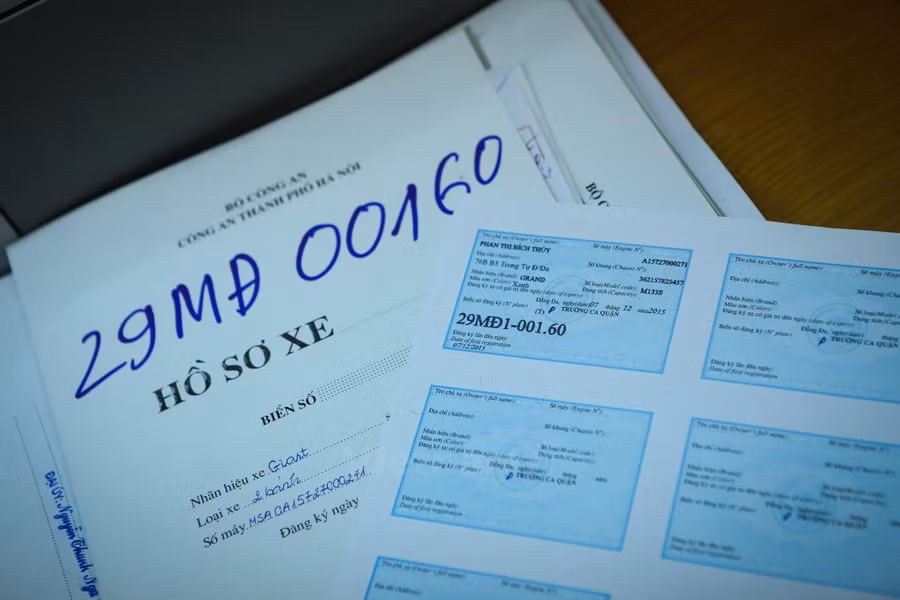 Với những trường hợp người dân muốn bán xe, họ phải đóng thuế trước bạ, tờ khai đăng ký xe rồi mang ra nộp tại điểm đăng ký xe nơi mình đang cư trú để nơi này chuyển sang họ tên chủ mới trên giấy đăng ký xe. Riêng biển số thì vẫn được giữ nguyên. (Ảnh: Minh Sơn/Vietnam+)
