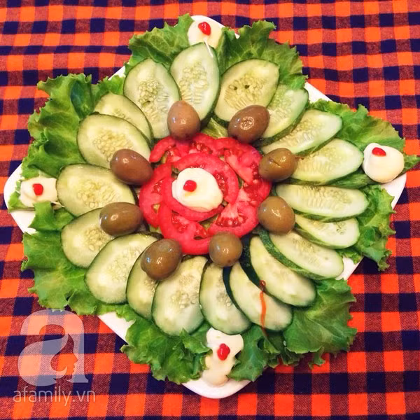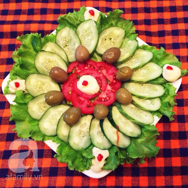 Bạn thái dưa chuột và cà chua thành từng lát mỏng rồi xếp vào đĩa kèm rau xà lách, quả oliu, thêm sốt mayonnaise.