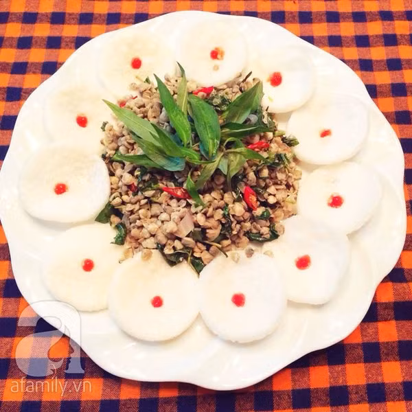 Thịt hến trụng qua nước sôi, sau đó tãi ra rổ cho ráo nước. Hành củ, tỏi, ớt cắt thật nhuyễn. Rau răm, hành lá nhặt rửa sạch sẽ rồi cắt nhỏ.