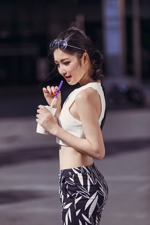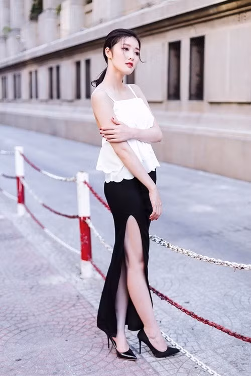 Trong trang phục áo hai dây mix với chân váy xẻ tà, người đẹp khoe đôi chân dài miên man cùng nét gợi cảm, nữ tính. Đây cũng là mẫu thiết kế được giới trẻ Việt yêu thích hiện nay.
