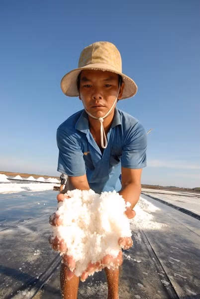 Hạt muối áp dụng mô hình trải bạt có độ trắng, sáng, không lẫn tạp chất và rất ít độ ẩm. Đây là mô hình không chỉ làm tăng năng suất, mà còn nâng cao chất lượng và giá thành so với cách sản xuất mối truyền thống của bà con bấy lâu nay.