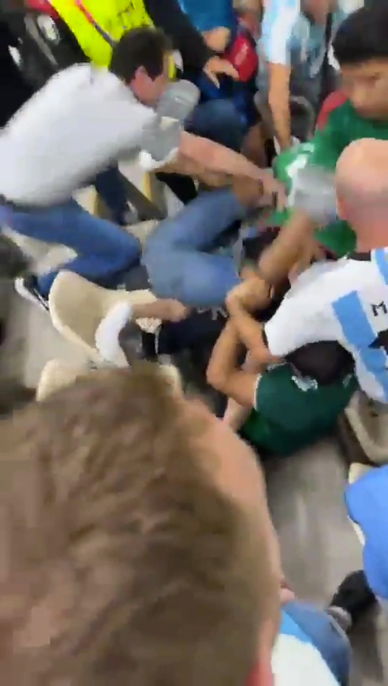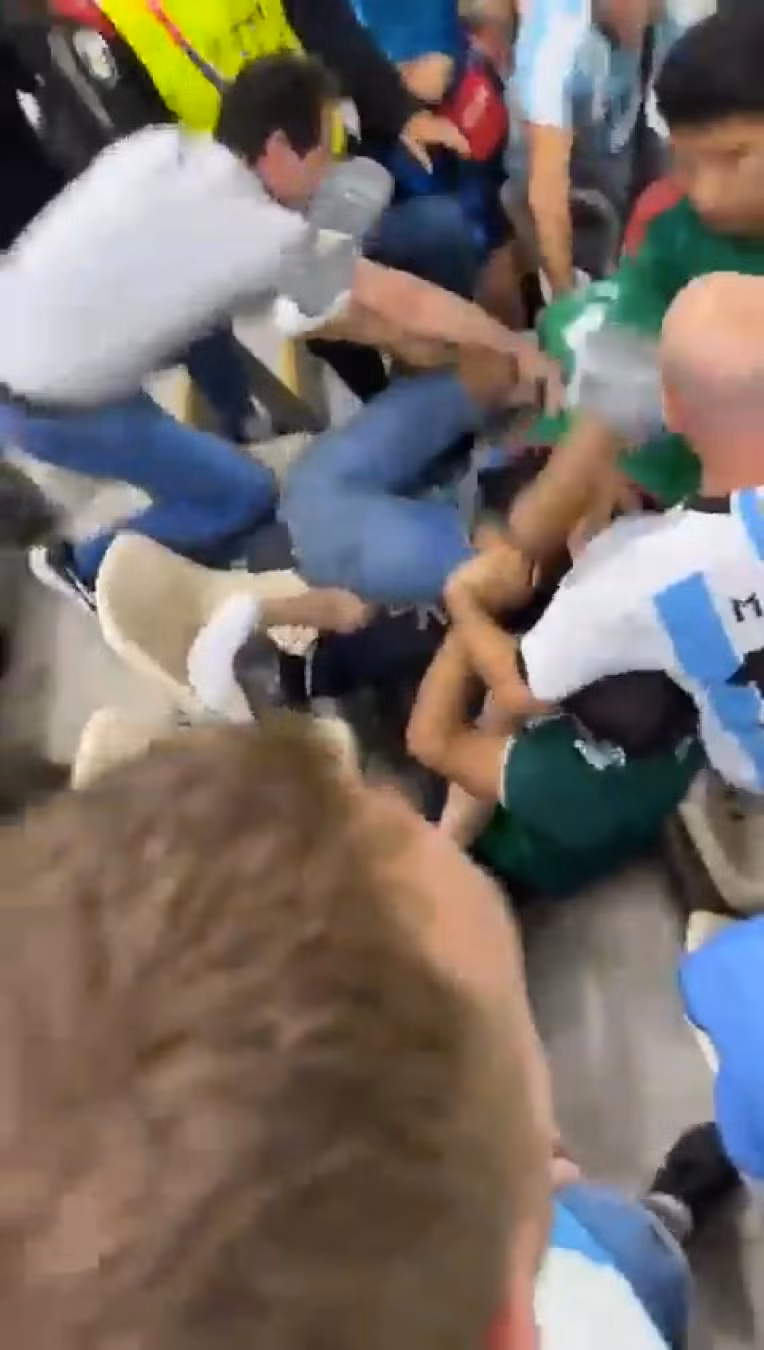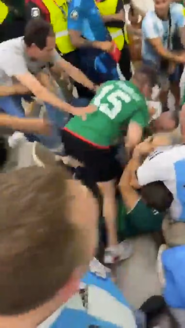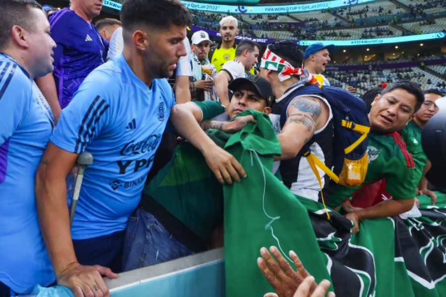 | Hình ảnh các cổ động viên Argentina và Mexico tẩn nhau trên khán đài sân Lusail ở Qatar. |