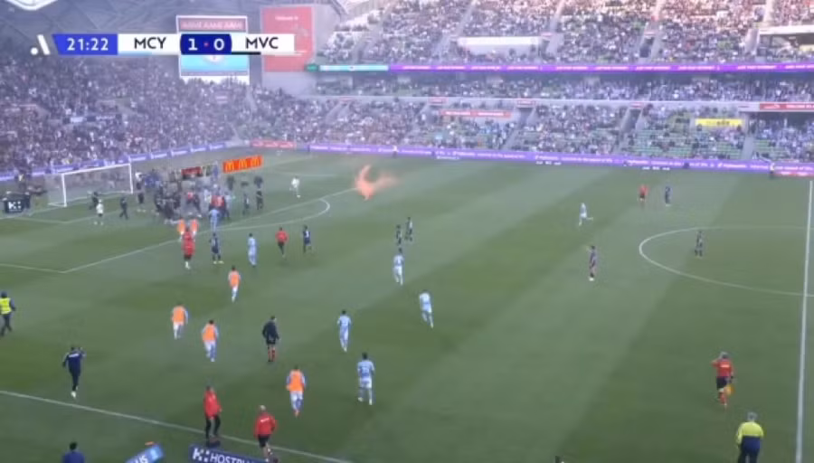 Tờ SunSport (Anh) mô tả, vụ hỗn loạn bắt nguồn từ việc có cổ động viên (CĐV) ném một quả pháo sáng từ trên khán đài xuống phía sau khung thành của Melbourne City.