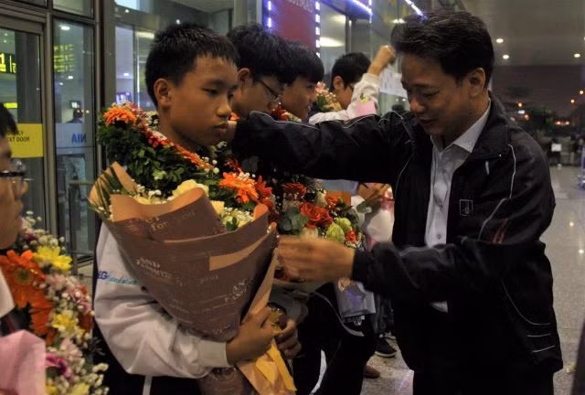 | Lãnh đạo phòng GD&ĐT Ba Đình và Trường THCS Giảng Võ đón học sinh tham dự CFM 2019 tại sân bay tối 30/12. |