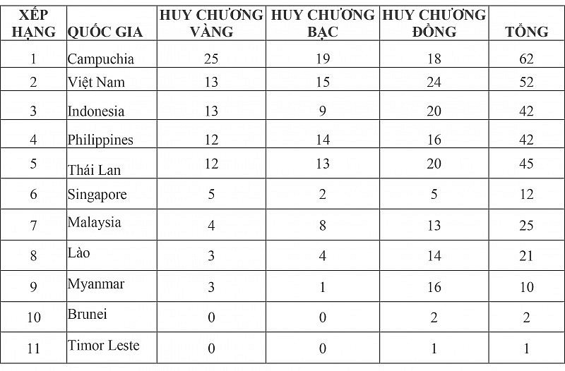 Tính tới 17 giờ 15 phút ngày thi đấu 7/5, đoàn chủ nhà Campuchia vẫn đang tạm dẫn đầu bảng xếp hạng với 25 HCV, 19 HCB và 18 HCĐ. Trong khi đó, Đoàn thể thao Việt Nam thi đấu bứt tốc vươn lên vị trí thứ 2 với 13 HCV, 15 HCB và 24 HCĐ.