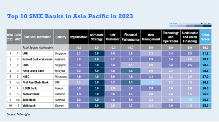 Tại Việt Nam, VietinBank đã xuất sắc vượt qua nhiều ứng cử viên sáng giá để chinh phục Hội đồng Giám khảo của The Asian Banker bằng chất lượng SPDV. Với điểm số được đánh giá vượt trội, The Asian Banker đã trao tặng VietinBank Giải thưởng Ngân hàng SME tốt nhất Việt Nam. Cũng với điểm số này, VietinBank đã lọt vào Top 10 Ngân hàng SME tốt nhất khu vực Châu Á -Thái Bình Dương, tăng 2 bậc so với năm 2022.