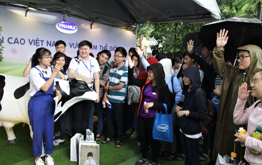 Mặc dù thời tiết không thuận lợi vào sáng sớm khi diễn ra chương trình nhưng điều đó không làm cản trở sự quan tâm, mong muốn tìm hiểu về Vinamilk - Nhà tuyển dụng Việt Nam được yêu thích nhất năm 2016 của các bạn sinh viên. Thông qua những trò chơi diễn ra trong gian hàng, các bạn sinh viên vừa có những khoảnh khắc vui vẻ, hào hứng, vừa có thêm thông tin hữu ích về Vinamilk.