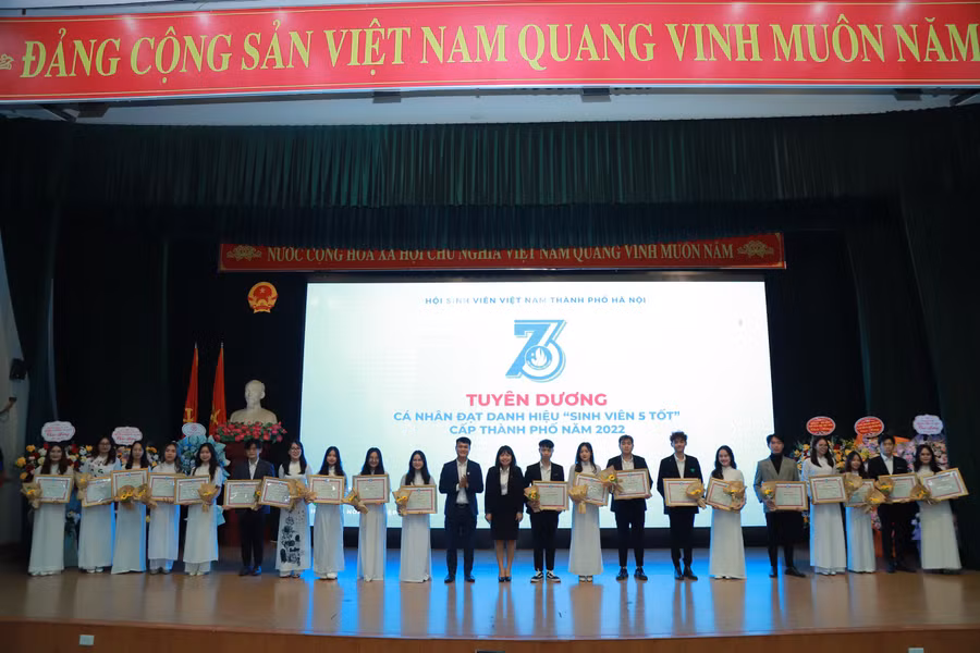 Tại chương trình, Hội Sinh viên Thành phố cũng tổ chức vinh danh 20 tập thể và 108 cá nhân 'Sinh viên 5 tốt' tiêu biểu cấp Thành phố. Đồng thời, trao tặng 50 suất học bổng hỗ trợ sinh viên nhân dịp Tết Nguyên đán Quý Mão 2023, trị giá 100 triệu đồng.