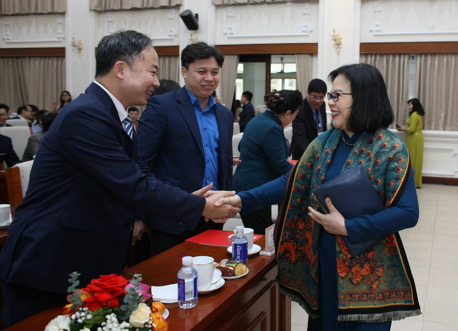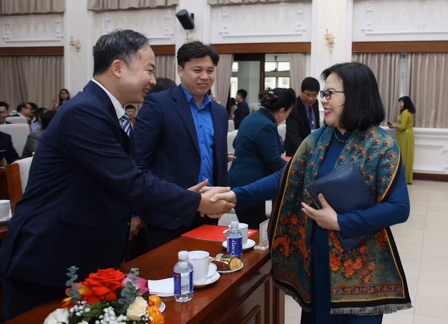 | Thứ trưởng Bộ GD&ĐT Ngô Thị Minh gặp gỡ các đại biểu tham dự buổi gặp mặt. |