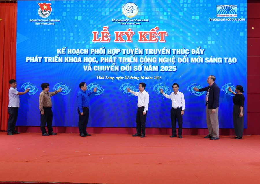 Chiều 24/10, tại Trường ĐH Cửu Long, Sở KH&CN tỉnh Vĩnh Long phối hợp Tỉnh đoàn Vĩnh Long tổ chức ký kết Kế hoạch tuyên truyền thúc đẩy phát triển khoa học, phát triển công nghệ, đổi mới sáng tạo và chuyển đổi số năm 2025.
