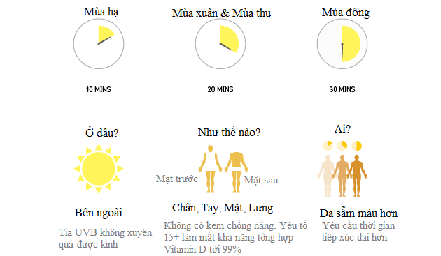 Ánh nắng mặt trời: Khi bạn tiếp xúc với ánh nắng mặt trời vào buổi sáng cũng là đang hấp thụ vitamin D tự nhiên. Bạn cần chú ý không phải thời gian nào tiếp xúc với ánh nắng mặt trời cũng hấp thụ được vitamin D, mà cần tuân thủ theo thời gian cụ thể như trong ảnh dưới đây.