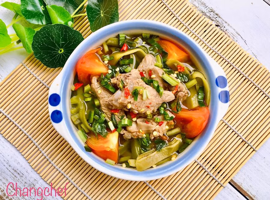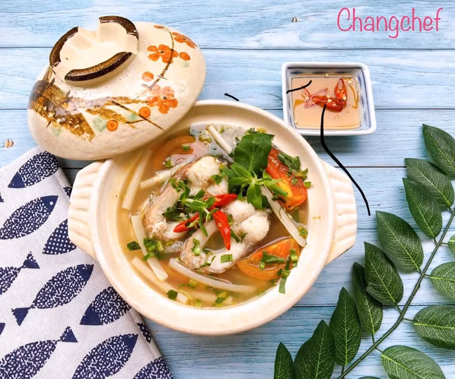 Từ trên xuống dưới: Canh cá diêu hồng nấu riêu, canh cá diêu hồng nấu măng chua, canh bí đỏ tôm tươi và canh bắp cải nấu sườn.