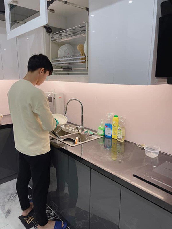 Nam cầu thủ không ngại xuống bếp rửa bát, làm việc nhà giúp vợ.