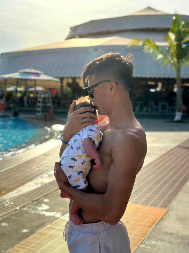 Thủ môn Bùi Tiến Dũng tranh thủ về nhà thăm con trai... Ảnh: FBNV.