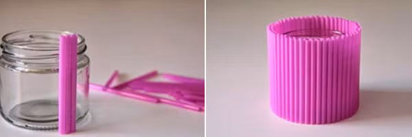 Bạn cắt ống hút thành nhiều đoạn có chiều dài dài hơn chiều cao của chiếc lọ 1cm. Tiếp theo, dùng keo dán các đoạn ống hút thẳng đứng bên ngoài thành lọ. Khi dán bạn nhớ dán các đoạn ống hút khít nhau cho đẹp. Vậy là bạn có chiếc bình để cắm hoa vừa đơn giản mà đẹp nhé!