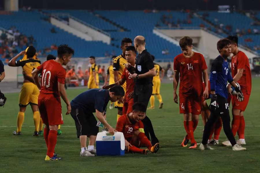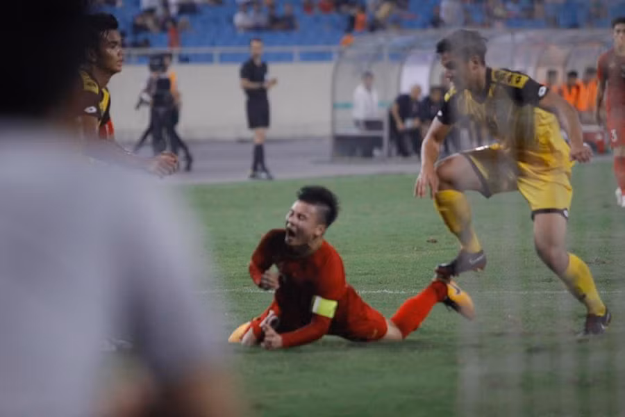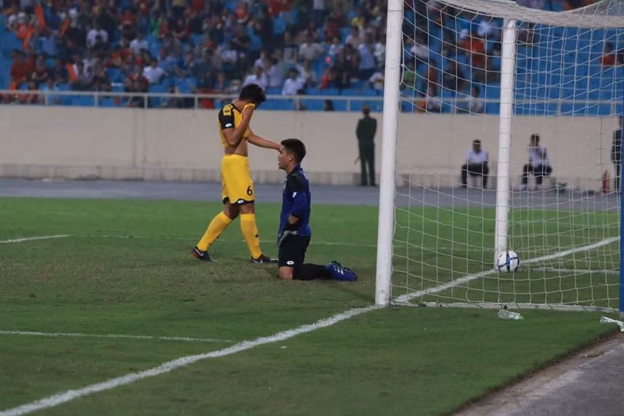 | Phút 77, Aminuddin nhận thẻ đỏ trực tiếp sau pha phạm lỗi với Quang Hải, và Tấn Sinh không mắc sai lầm trên chấm 11m để mang về bàn thắng thứ 5 cho tuyển U23 Việt Nam. |